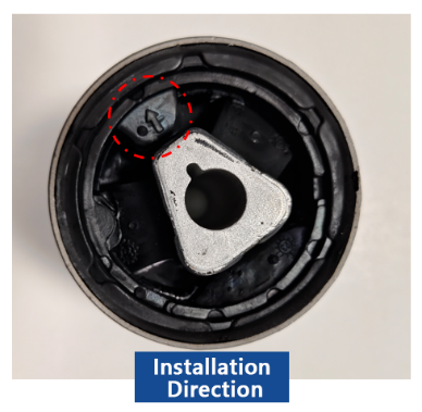 در حین نصب، اطمینان حاصل کنید که بخش جامد (غیر شکاف) بوش با جهت افقی حرکت خودرو به جلو تراز است. اگر بوش دارای یک فلش جهت باشد، این فلش باید در جهت حرکت به سمت جلو باشد.