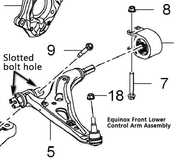 تصویر بالا مجموعه بازوی کنترل پایینی جلو برای شورولت اکینوکس را نشان می دهد. فلش ساختار سوراخ باز پیچ را در مجموعه بوش نشان می دهد.