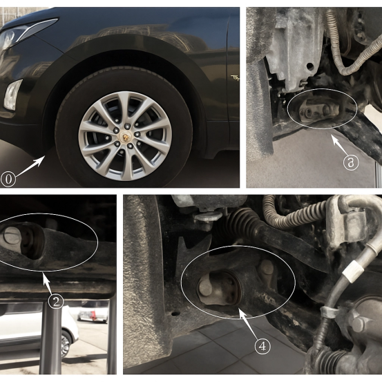 مجموعه قبلی از عکسها وضعیت ساختاری خرابی بوش بازوی کنترل تعلیق جلو در شورولت اکینوکس را نشان میدهد. این به کاربران توصیه می کند که همانطور که در نمودار بالا نشان داده شده است، می توان با چرخاندن فرمان به حالت قفل کامل در موقعیت ①، اجزای ساختاری با خرابی احتمالی را بررسی کرد. بررسی ایمنی مجموعه بوش باید از طریق عکسهای گرفته شده در مکانهای مختلف از جمله موقعیتهای ②، و ④ انجام شود.